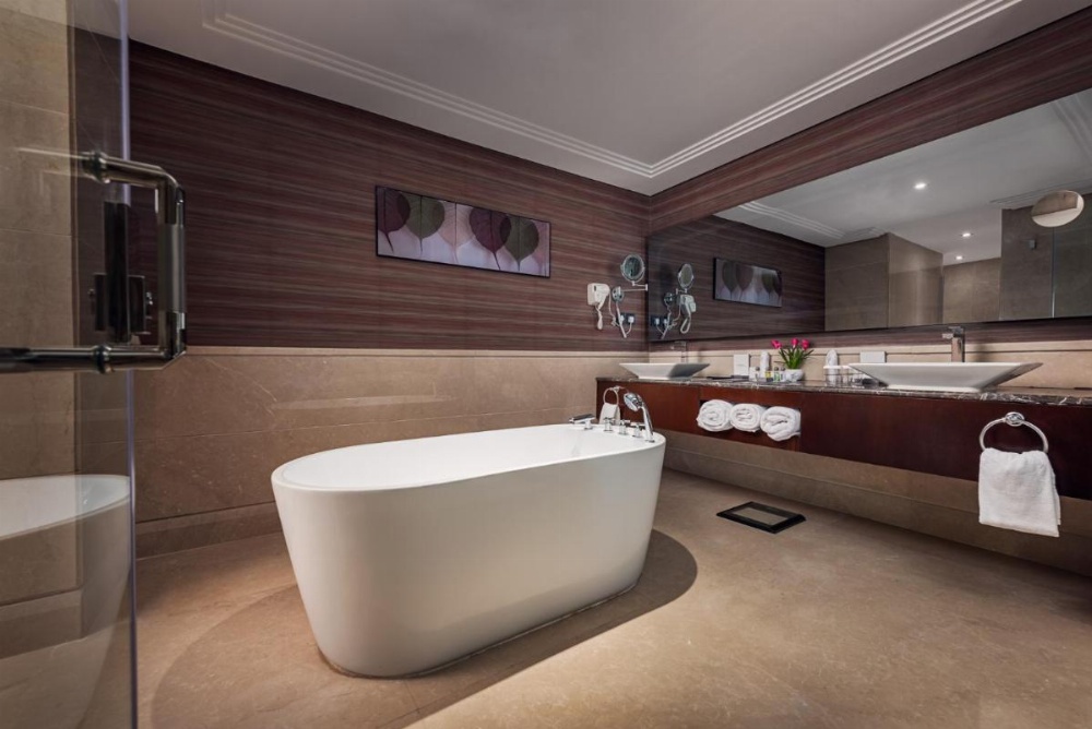 The suite features a city view, a king size bed, and an attached bathroom with a tub, a shower with a smart control panel for water and temperature adjustments, and a smart mirror. The suite also offers parquet flooring, central air conditioning, a sofa bed, free WiFi, an LCD TV screen, a media hub, and a mini fridge. It also features an outside room display on the room TV through a built-in camera, an electric curtain, a control panel for the do not disturb and the make up signs, an auto door open button, a tea and coffee hospitality tray and a digital safe box.